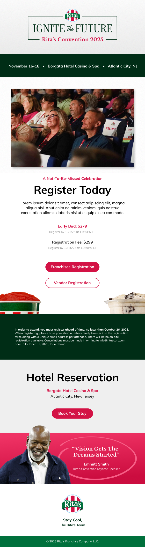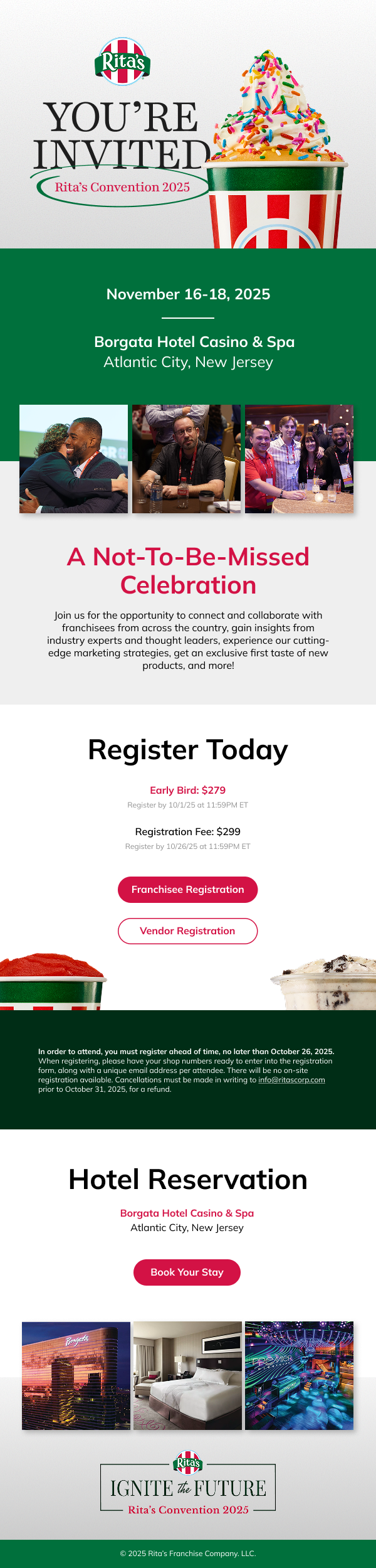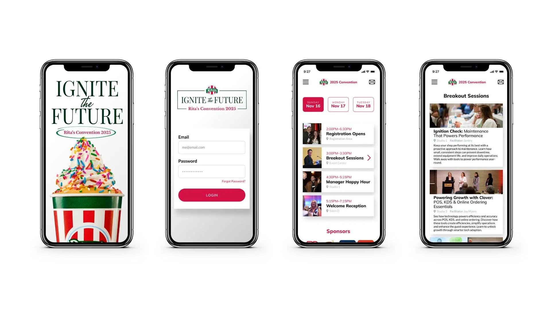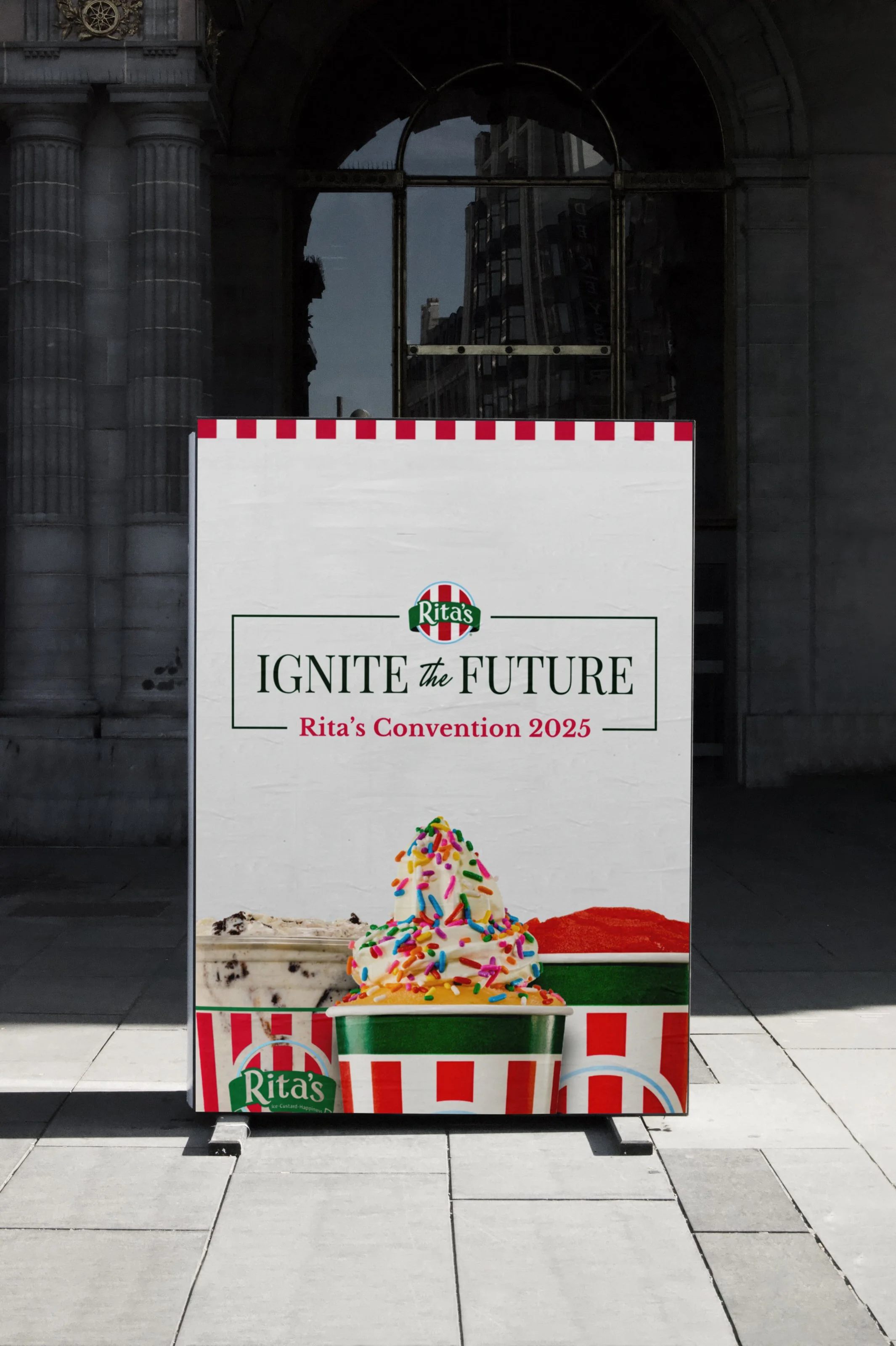 Every year, people gather for the highly anticipated Rita’s Annual Convention. This event brings together employees from shops, franchisee owners, shareholders, internal marketing professionals, and more to reflect on and celebrate the success of Rita’s Italian Ice over the year prior. Each year, this event requires a visual identity that falls within the well-known Rita’s brand while still setting the event apart. This visual identity includes logo design, save the dates, emails designs, event signage, merchandise, website and app screens, animated assets and more.