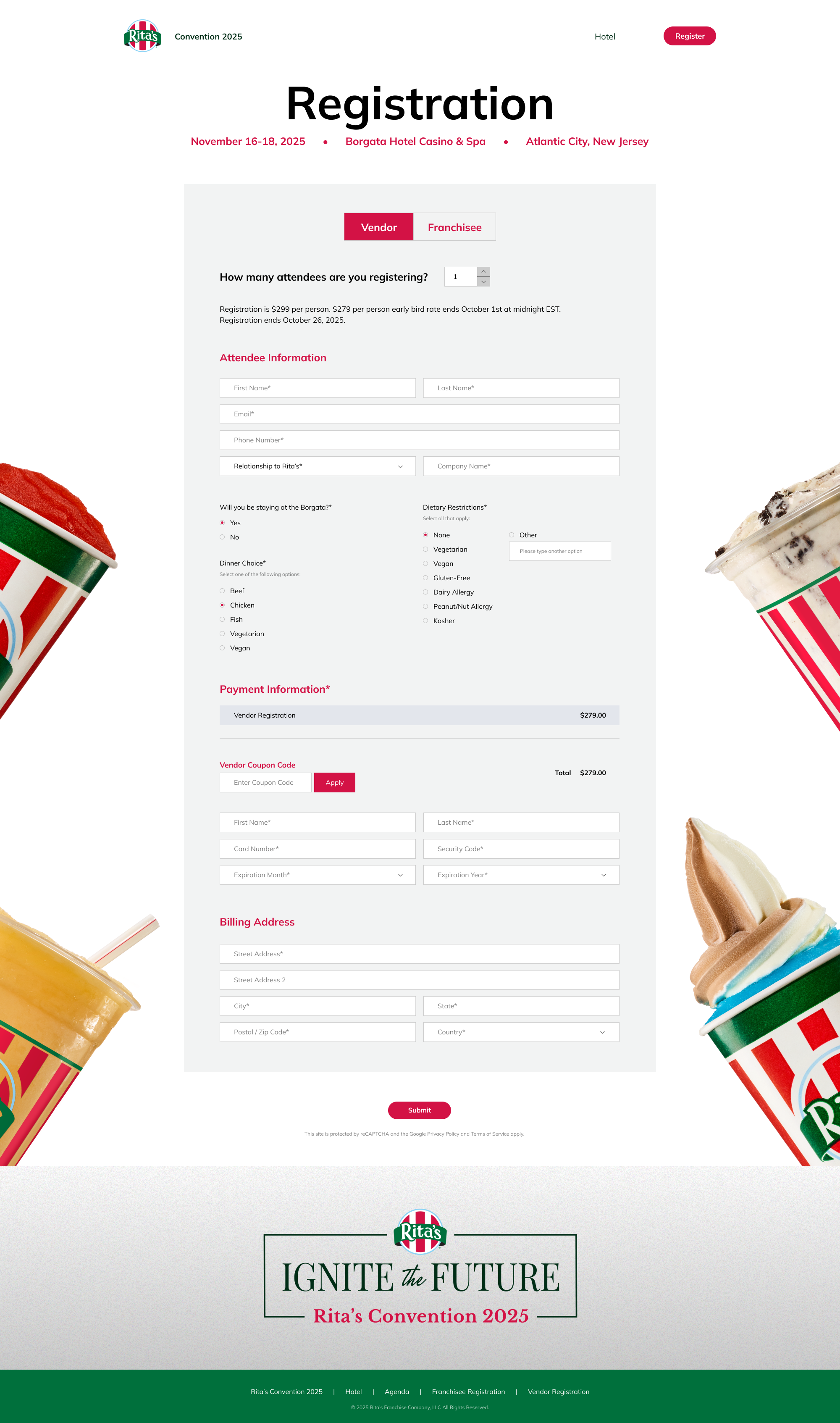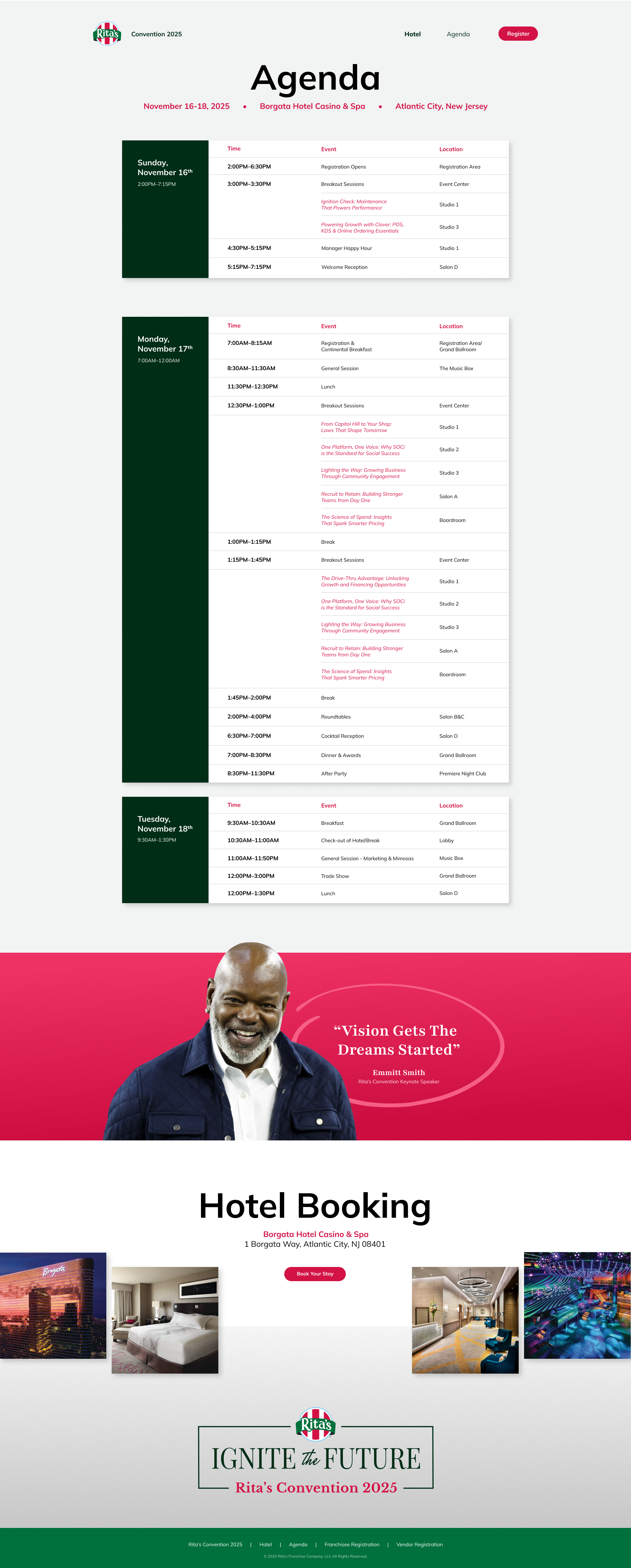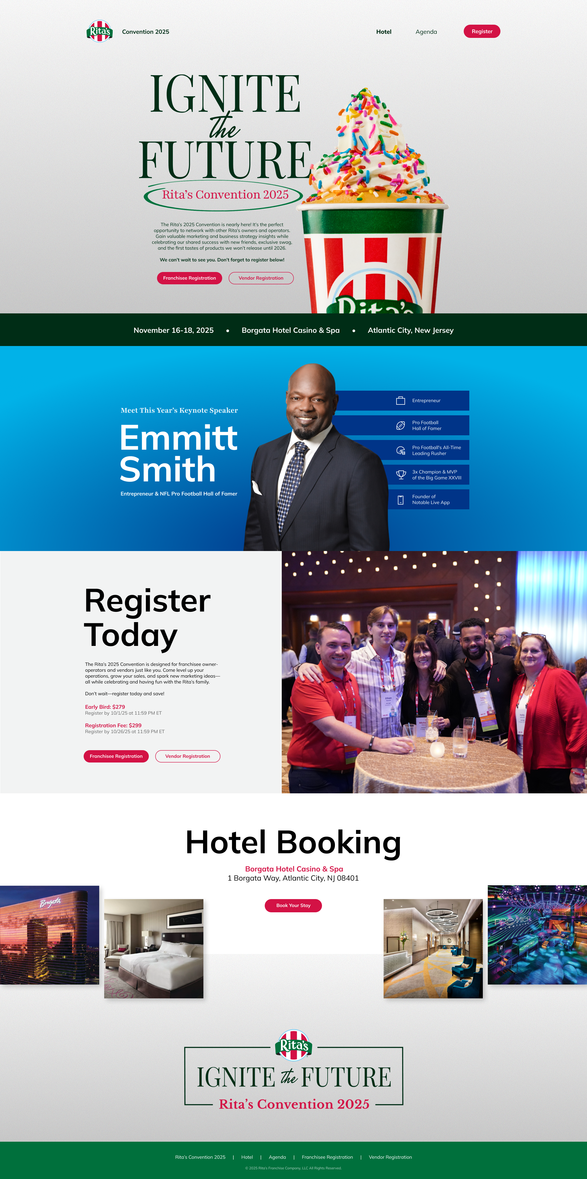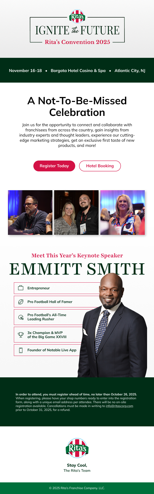 Every year, people gather for the highly anticipated Rita’s Annual Convention. This event brings together employees from shops, franchisee owners, shareholders, internal marketing professionals, and more to reflect on and celebrate the success of Rita’s Italian Ice over the year prior. Each year, this event requires a visual identity that falls within the well-known Rita’s brand while still setting the event apart. This visual identity includes logo design, save the dates, emails designs, event signage, merchandise, website and app screens, animated assets and more.
